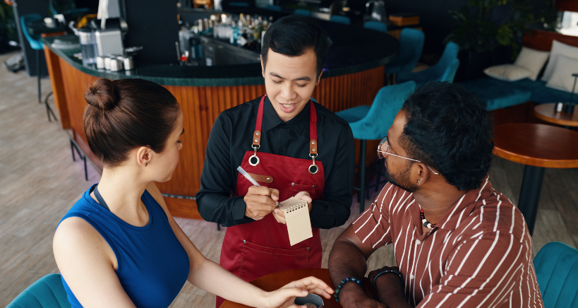 Restaurant staff talking to customer